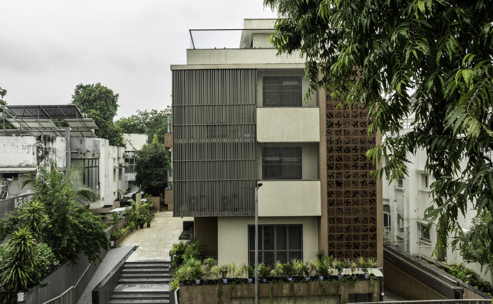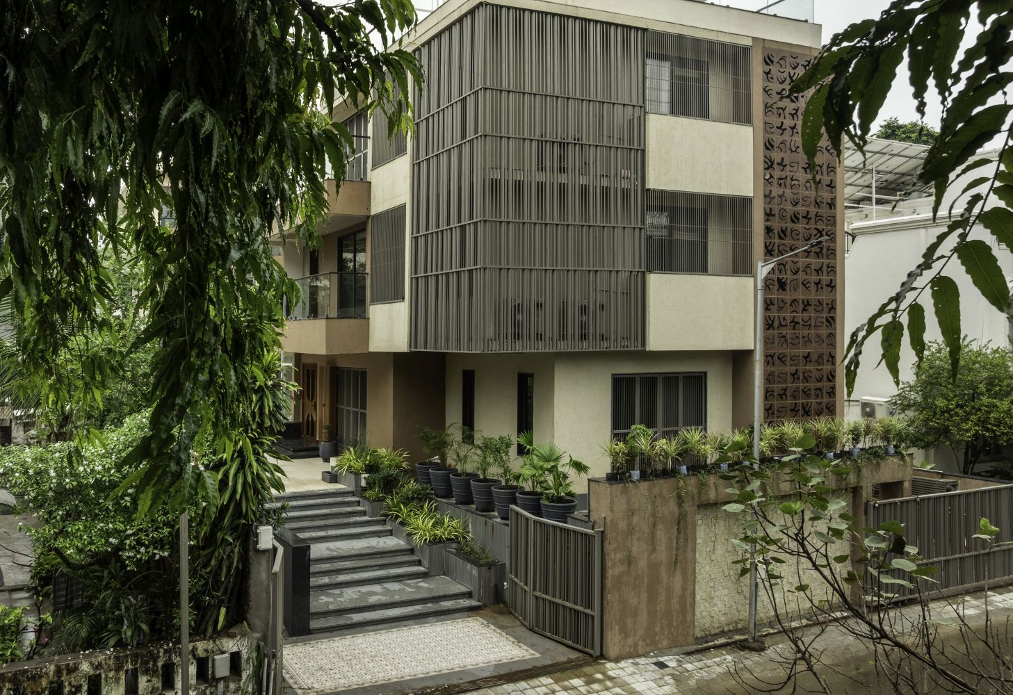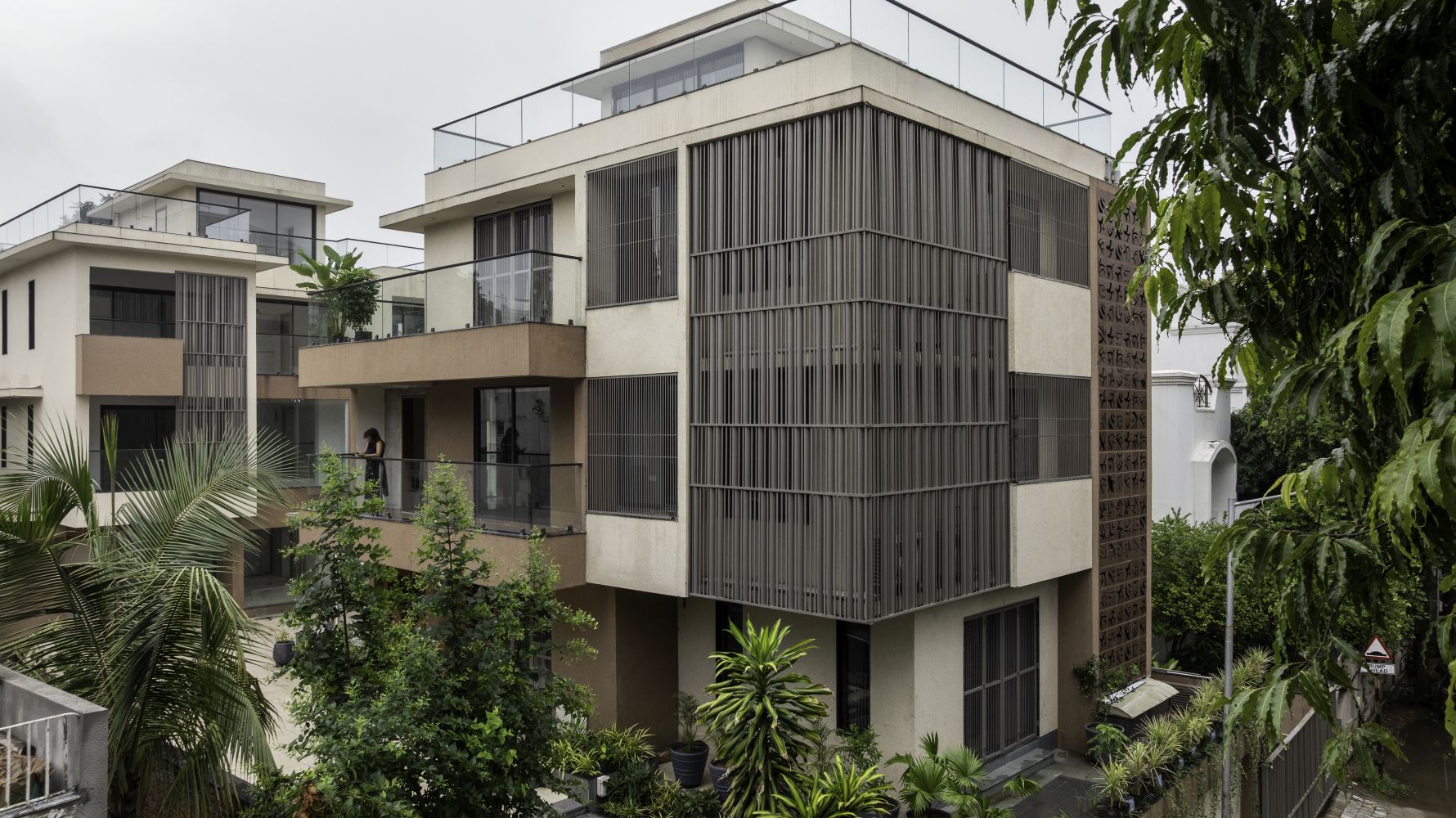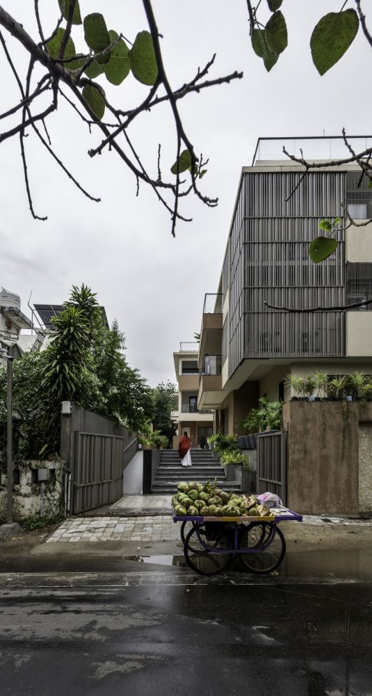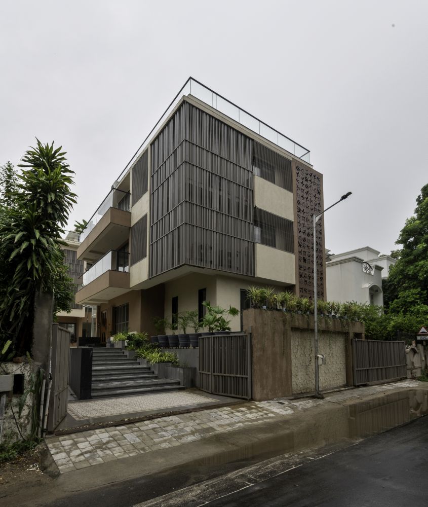 Designed for two sibling families, this project explores a thoughtful model for multi-family living within a dense urban context. To address the lack of on-site parking, the residence is elevated on a large plinth that accommodates six vehicles, transforming the raised ground level into a vehicle-free communal zone. At its center lies a shared courtyard that encourages everyday interaction, celebrations, and a strong sense of family connection. Although the homes are equal in size and amenities, they remain physically separate and are linked through carefully planned connections to balance accessibility with privacy. Screens and vertical louvers filter sunlight, ensure privacy, and create a breathable façade suited to the dense surroundings. A centrally placed Ghar Mandir opening into the courtyard reinforces the home’s role as a shared spiritual and social anchor.